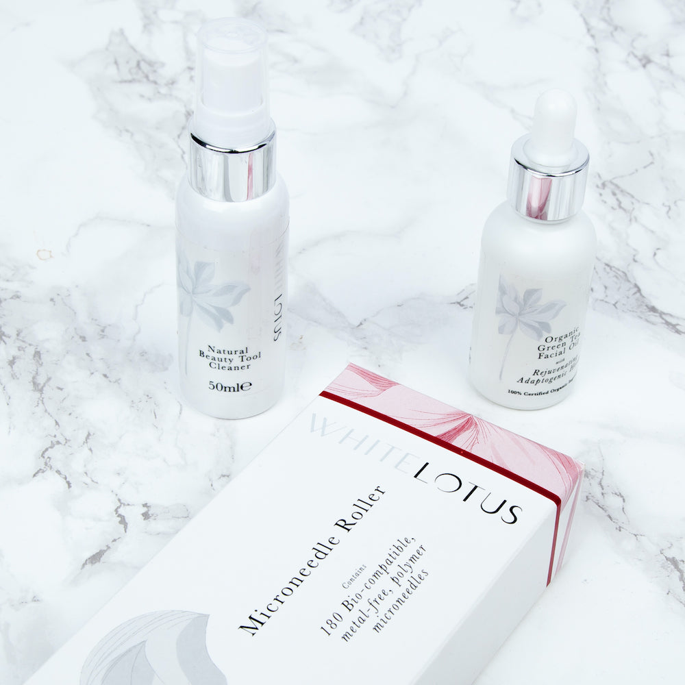 This is combined with a traditional green tea oil serum to protect the skin and the natural dermaroller cleaner to guarantee the rollers sterility.